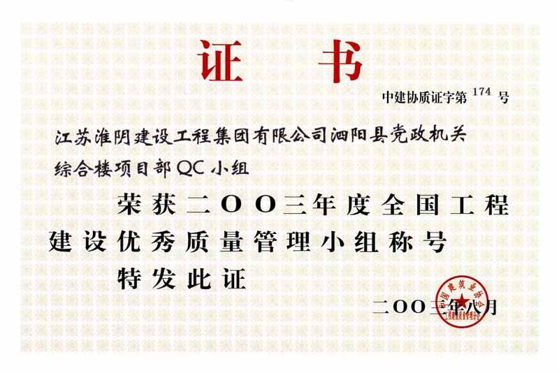 2003年国家级QC泗阳县党政机关综合楼项目部