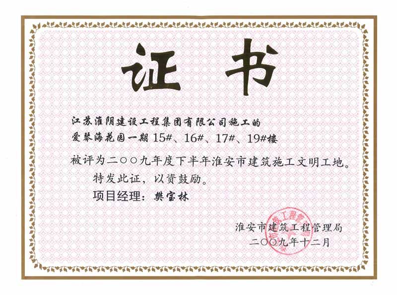 2009年市文明工地爱情海花园一期15、16、17、19号楼(樊宝林)